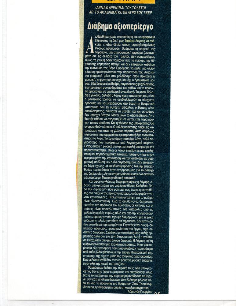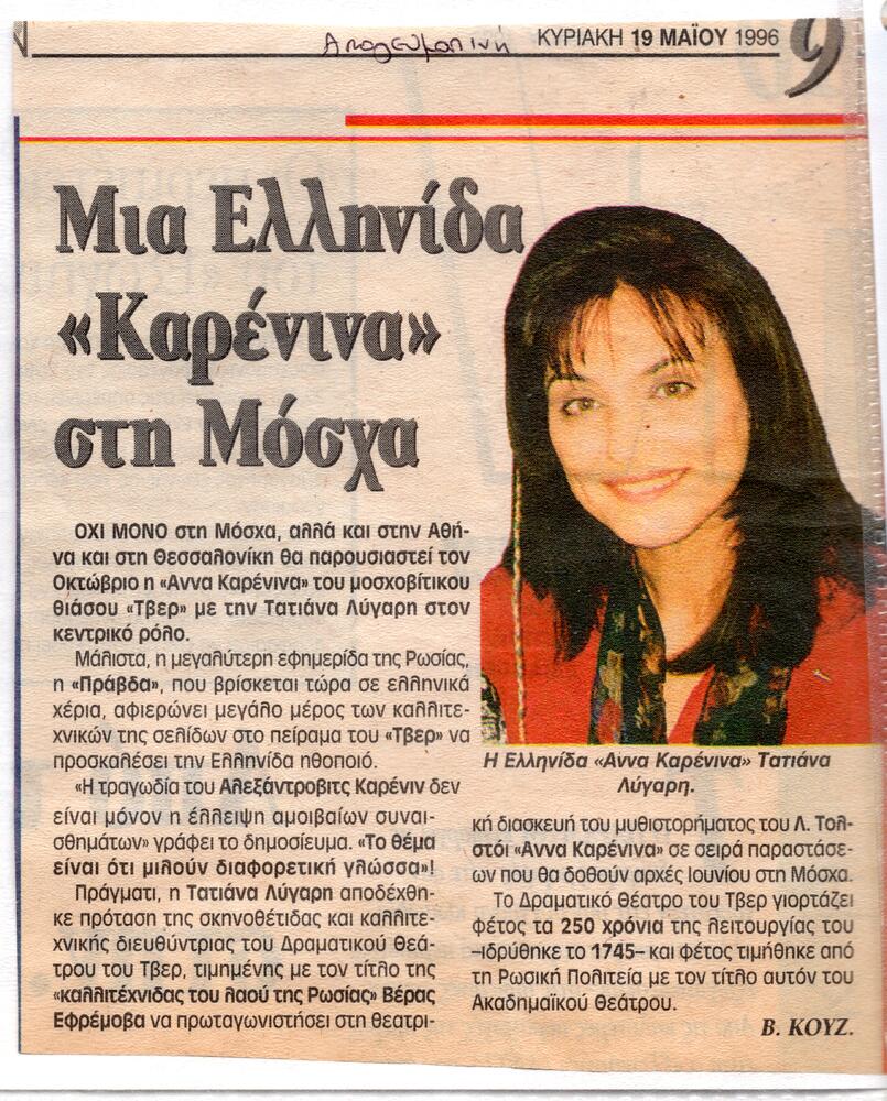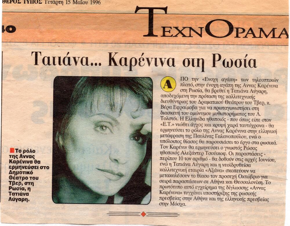 Το Ακαδημαϊκό Θέατρο του Τβερ της Ρωσίας και η Τατιάνα Λύγαρη μετά την τεράστια επιτυχία που σημείωσαν οι παραστάσεις που έδωσαν στη Ρωσία με τη θεατρική διασκευή του κλασικού αριστουργήματος του Λέοντος Τολστόι Άννα Καρένινα έρχονται στην Ελλάδα για 4 μόνο παραστάσεις στο Δημοτικό Θέατρο Πειραιά στις 4, 5, 6, 7 Οκτωβρίου 1996.