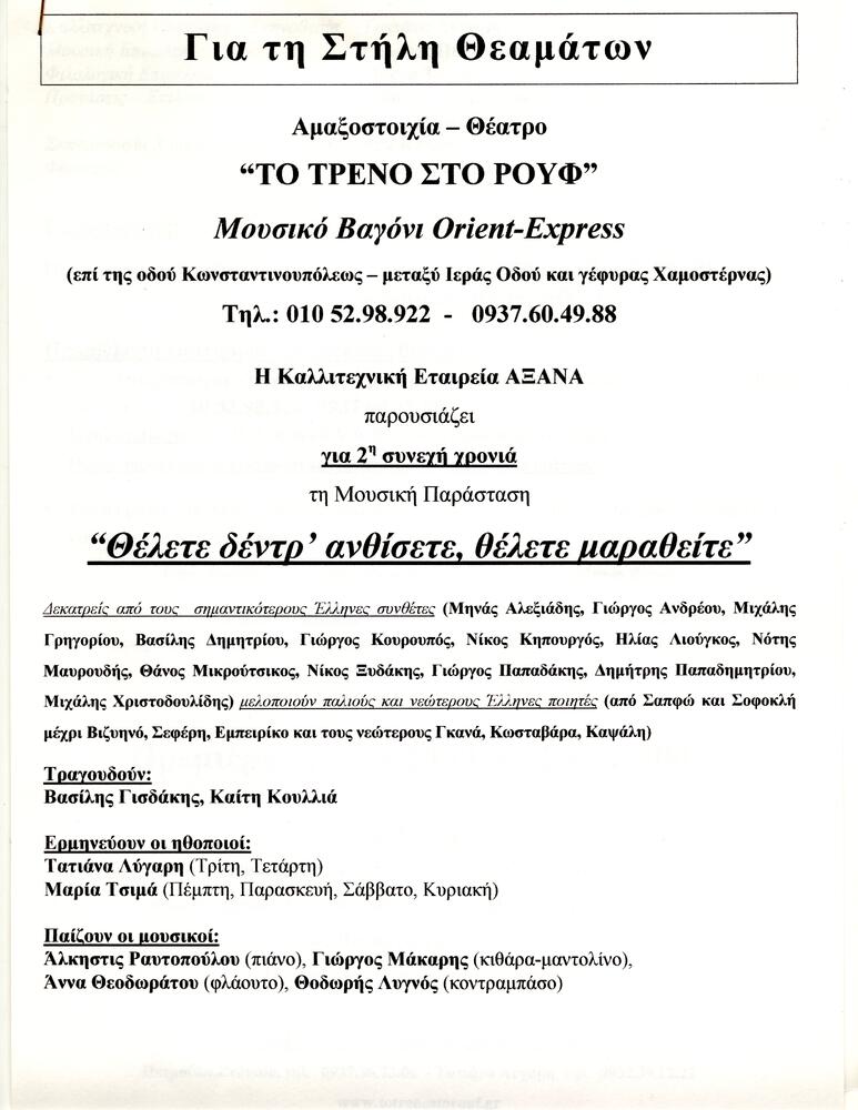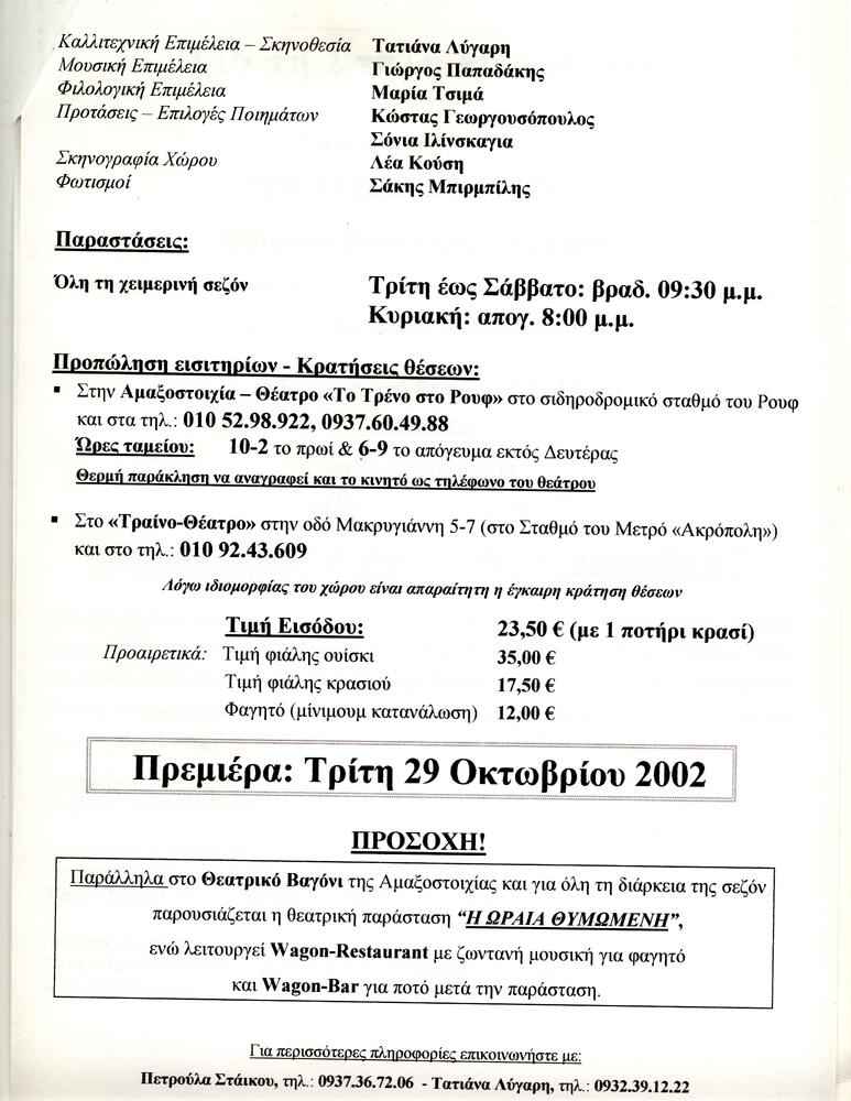 "Πριν από τρία χρόνια δεν θα μπορούσα καν να το φανταστώ. Θα εγκαταλείψω εγώ μόνο του το κομπιούτερ μου στο γραφείο και θα τρέχω στις πρόβες με μια ετερόκλητη, (αλλά υπέροχη) παρέα από ηθοποιούς, σκηνοθέτες, μουσικούς, συνθέτες, χορογράφους και φωτιστές που προσπαθούν να δώσουν σάρκα και οστά στο κείμενό μου, να κάνουν τη «θυμωμένη» μου τόσο «ωραία» που να μιλήσει στην καρδιά σας;
