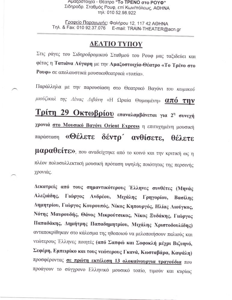 | Θέλετε δέντρ’ ανθίσετε, θέλετε μαραθείτε, απόκομμα Τύπου, ΡαδιοτηλεόρασηΑποκόμματαΘέλετε δέντρ’ ανθίσετεΑπόκομμα ΤύπουΜουσικό Βαγόνι Orient Express |