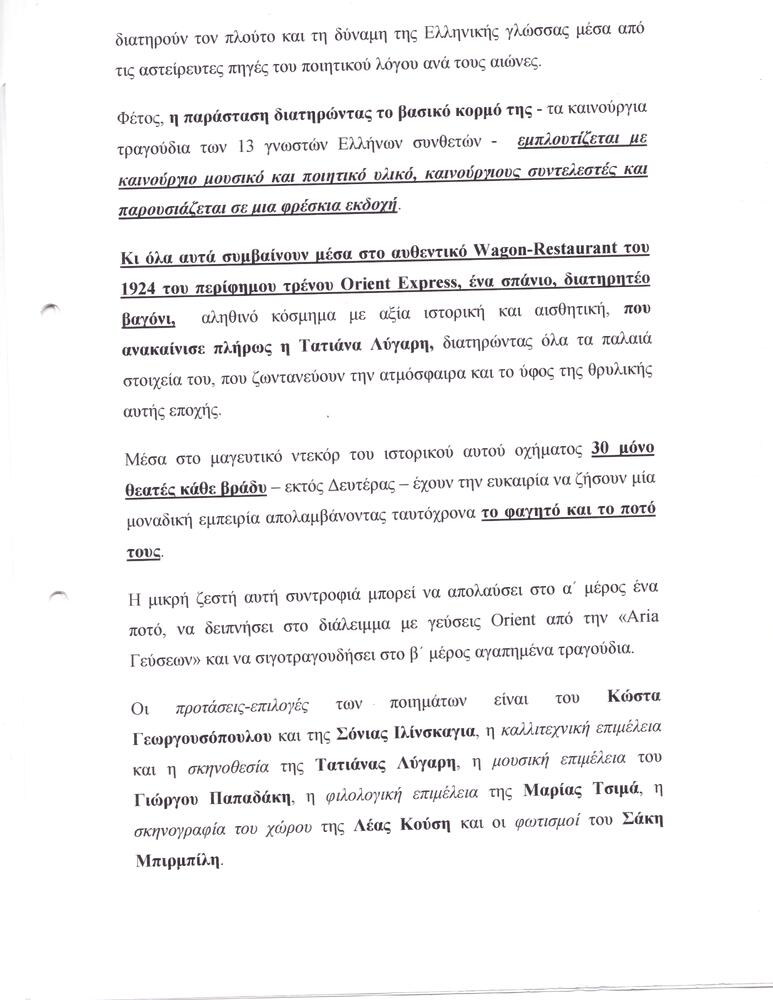 | Θέλετε δέντρ’ ανθίσετε, θέλετε μαραθείτε…, πρόγραμμα μουσικής παράστασηςΠρογράμματαΠρόγραμμαΜουσικό Βαγόνι Orient Express |