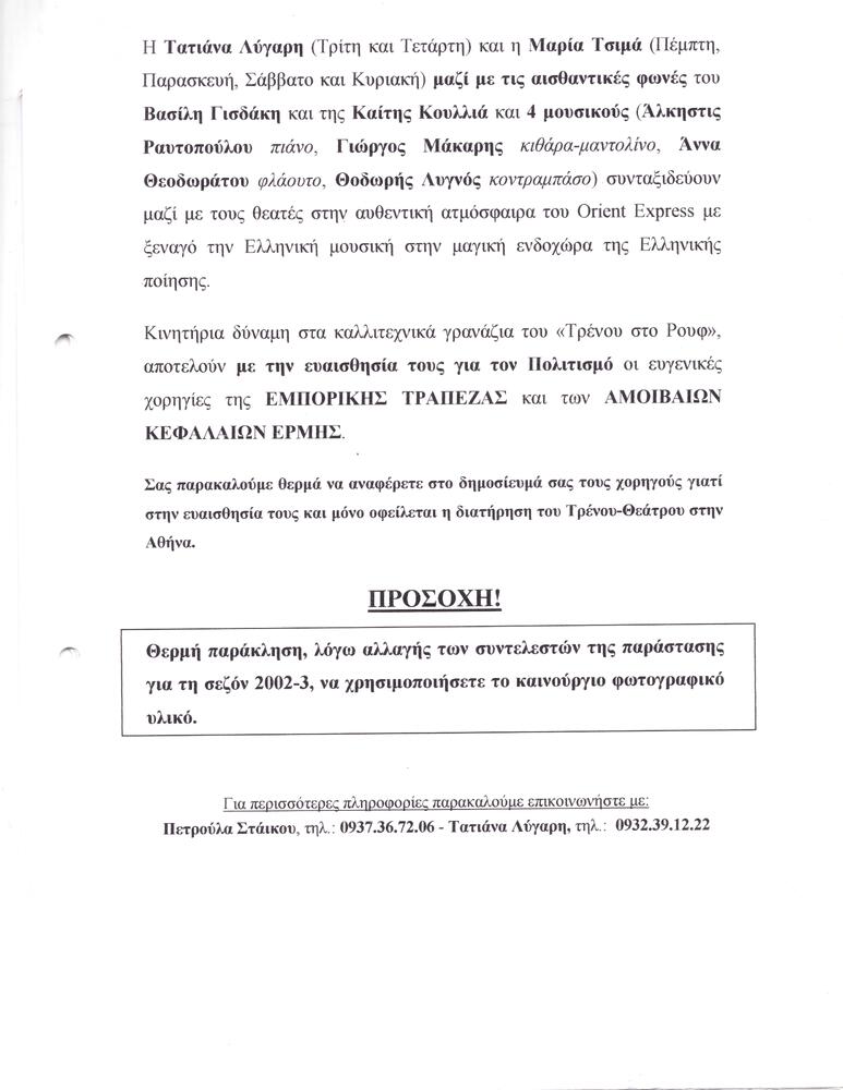| Θέλετε δέντρ’ ανθίσετε, θέλετε μαραθείτε…, πρόγραμμα μουσικής παράστασης (2ος χρόνος)ΠρογράμματαΠρόγραμμαΜουσικό Βαγόνι Orient Express |